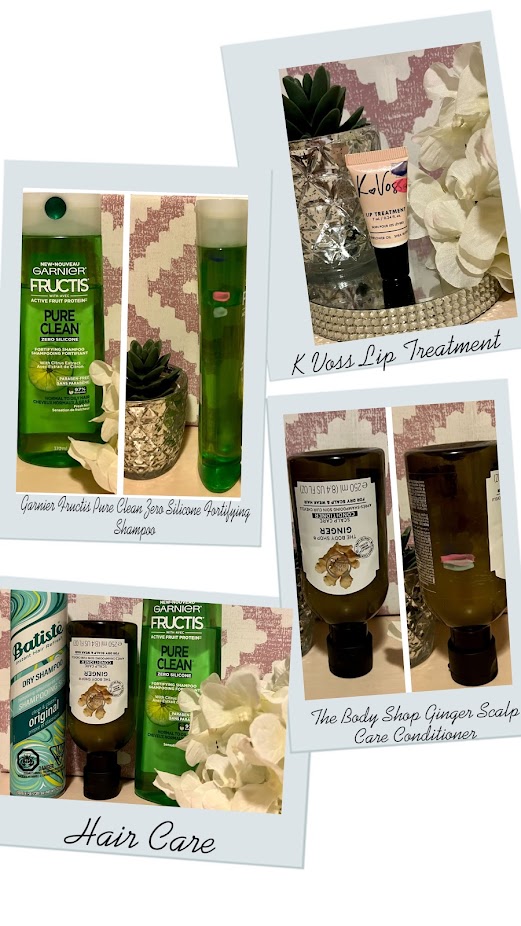 To follow-up on my lip scrub, I finish my nightly routine with the K.Voss Lip Treatment in Fig Macaroon. This is a thick lip balm that I use to moisturize my lips overnight. Finally, I have hair care products as part of my year-long panning project. Currently I am using the Garnier Fructis Pure Clean Zero Silicone Fortifying Shampoo and The Body Shop Ginger Scalp Care Conditioner which I store upside down as it is a thick conditioner, so it is easier to squeeze out of the bottle. I also use the Batiste Dry Shampoo halfway through the week (I wash my hair once per week) to absorb any excess oil on my scalp.